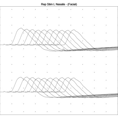 - Repetitive nerve stimulation at 2 to 3 Hz would show a decrement in compound muscle action potentials (CMAPs) due to the progressive failure of neuromuscular transmission.